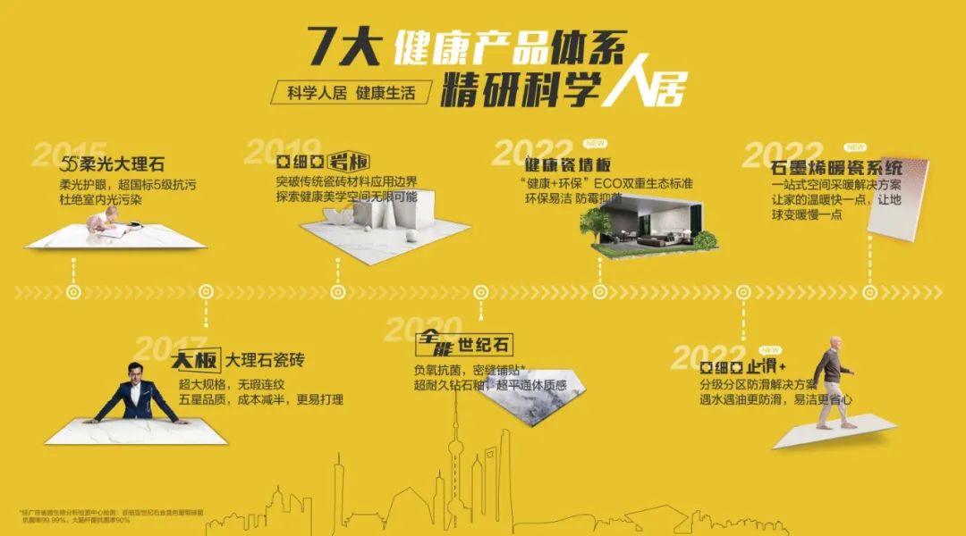 亚细亚瓷砖深度贯彻消费者需求,以强大的技术研发能力和生产制造实力,打造领先的产品竞争力。 以人居功能为核心,构架设计、产品、研发、营销等竞争格局,通过不断创新,研发出7大健康产品体系:从“遇水遇油更防滑、全场景分级解决方案”的「亚细亚止滑+」,到“环保易洁、 防霉抗菌”的「健康瓷墙板」,以及“拒绝室内光污染”的「55°柔光大理石系列」。