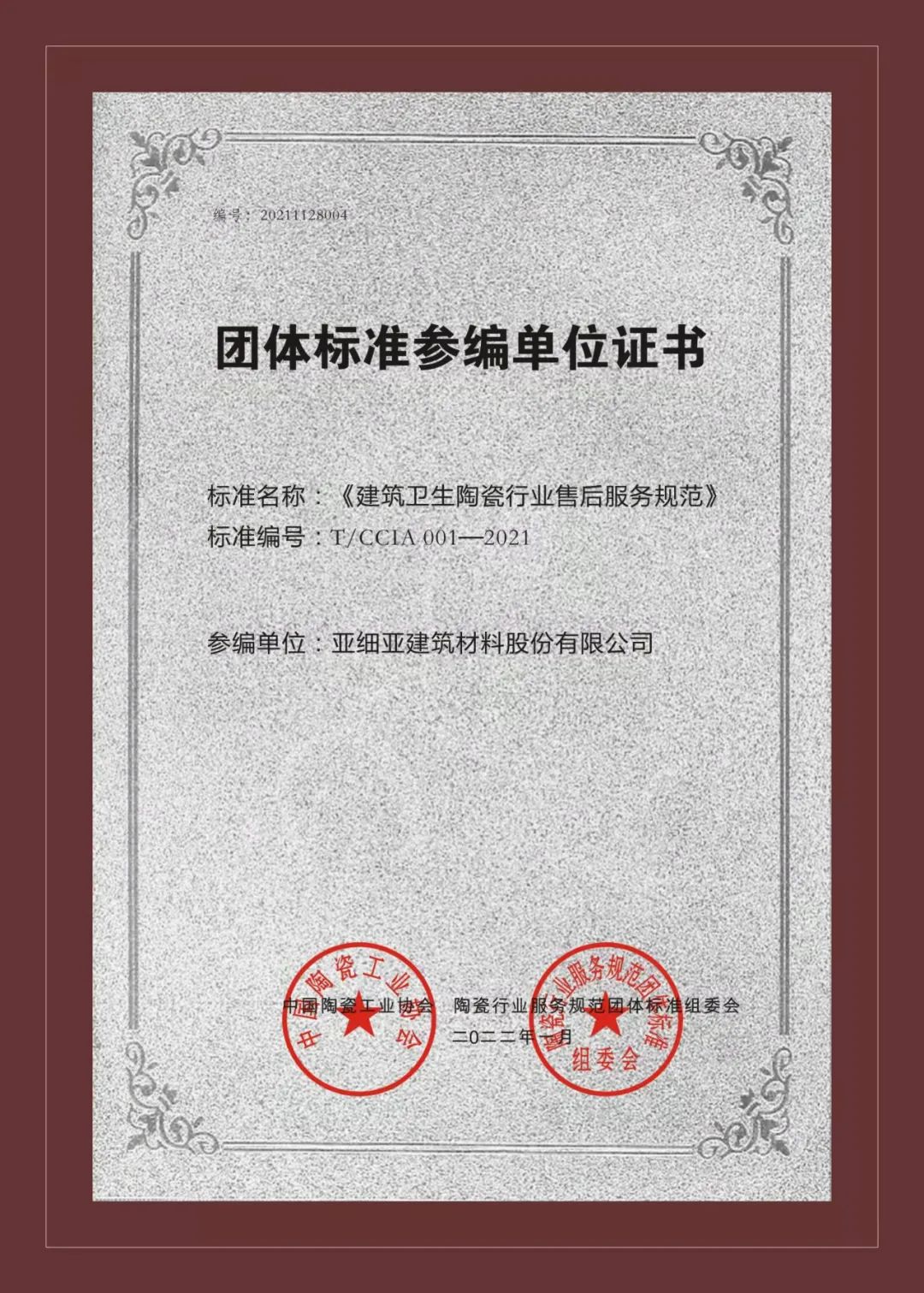 亚细亚瓷砖作为建筑卫生陶瓷行业售后服务规范团队标准起草单位之一,被授予《建筑卫生陶瓷行业售后服务规范》团体标准参编单位证书。