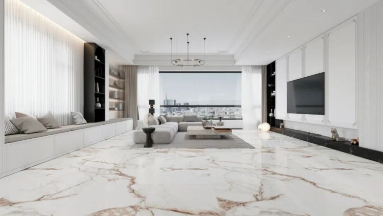 塞浦路斯米黄以暖色为底色,温润的纹理如涓涓溪流,远看不花哨,近看有细节。750*1500黄金规格通铺,空间整体感更强,搭配低饱和色系软装,凸显客厅的层次感,与奶油风是“绝佳CP”