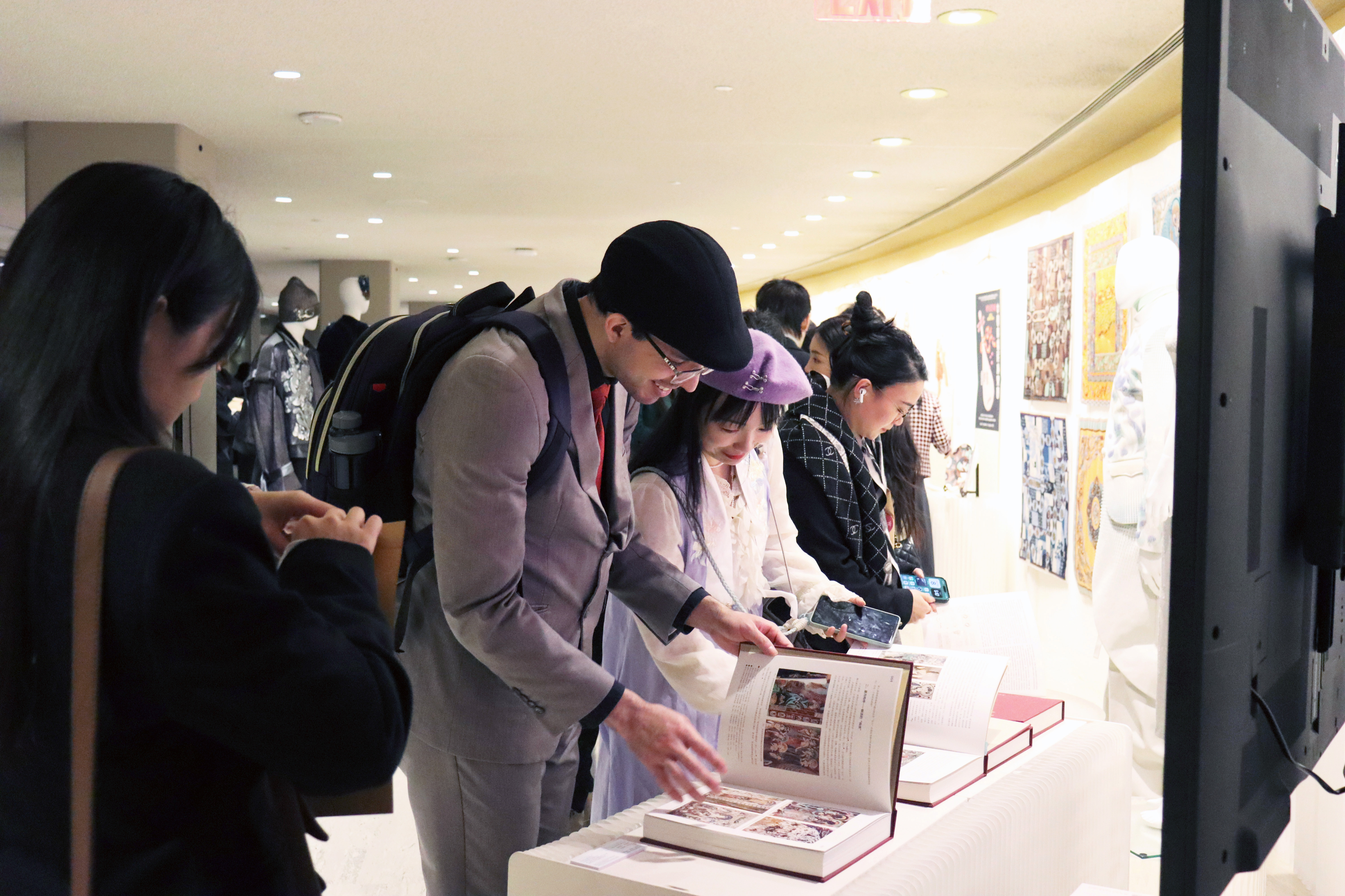 第二个时期涵盖最近20年间学院师生及校友创作的作品。他们以敦煌艺术为主题,从多角度进行创作,既运用织、染、绣等中国传统非遗技艺,也结合3D打印、AIGC等现代科技手段,作品涵盖绘画、服装、建筑、纺织品、雕塑、虚拟艺术等多个门类,充分展现了学院在敦煌艺术研究与传承上的深度与广度,以及在当代语境下的多元演绎与创新活力。此外,现场还展出了敦煌壁画临摹、服饰研究与图案资料整理等珍贵专著与文献资料。