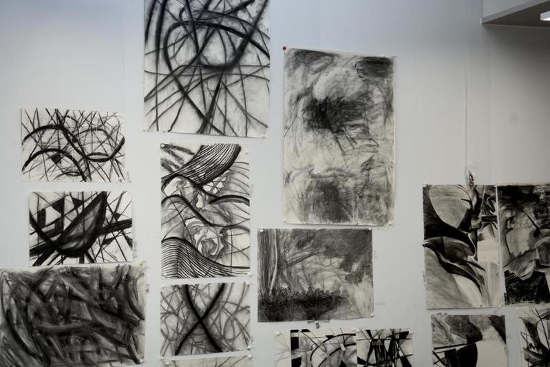 课堂四周墙面挂满了学生习作:狂放的线条交织,细腻的笔触铺陈,在黑白灰的丰富层次中,清晰呈现出学生从观察实物到提炼抽象语言的创作轨迹。周莉副院长
