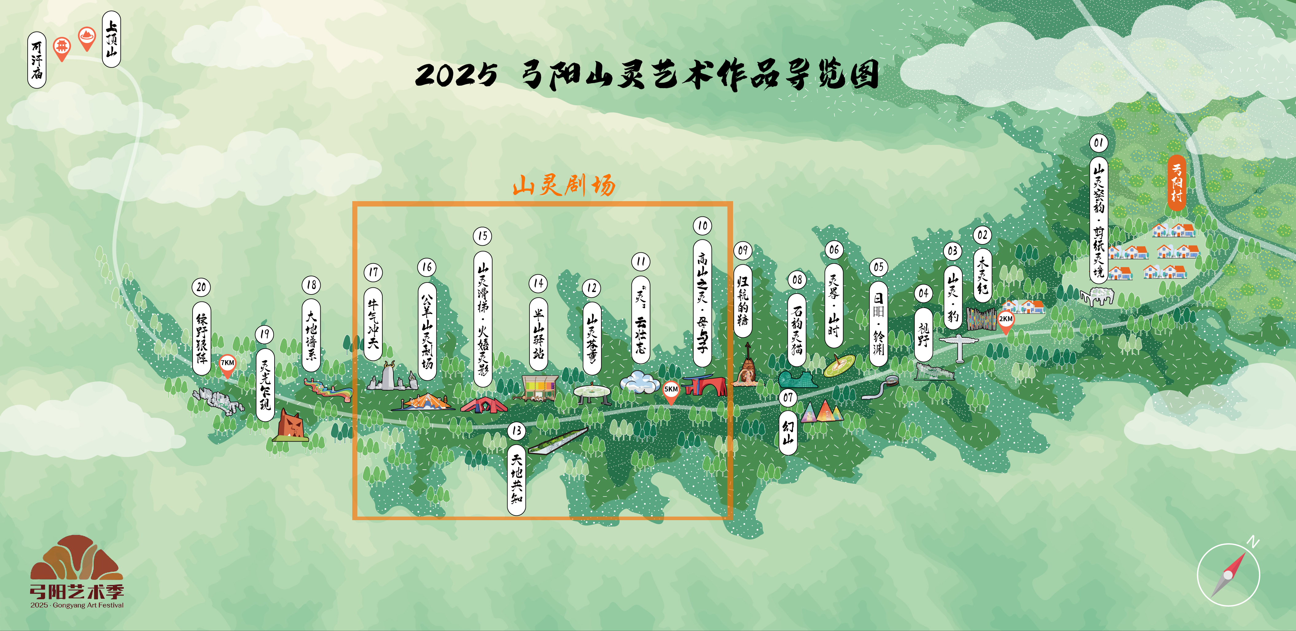艺术季策展人、美院博士高满君介绍道:从前期实地考察到作品最终落地,全部20件作品历时约7个月完成,汇聚了近200位参与者的共同创造。同时,本次艺术季以“弓阳山灵”为主题,围绕自然生态、基因文化、地方产业三大核心,深入挖掘其中蕴含的内在元素进行创作。在空间布局上,作品沿上山路径向山顶方向合理分布,并在核心区域设置了“山灵剧场”。这些空间不仅构筑起完整的艺术现场,也为未来文旅体验活动奠定了可持续的基础。