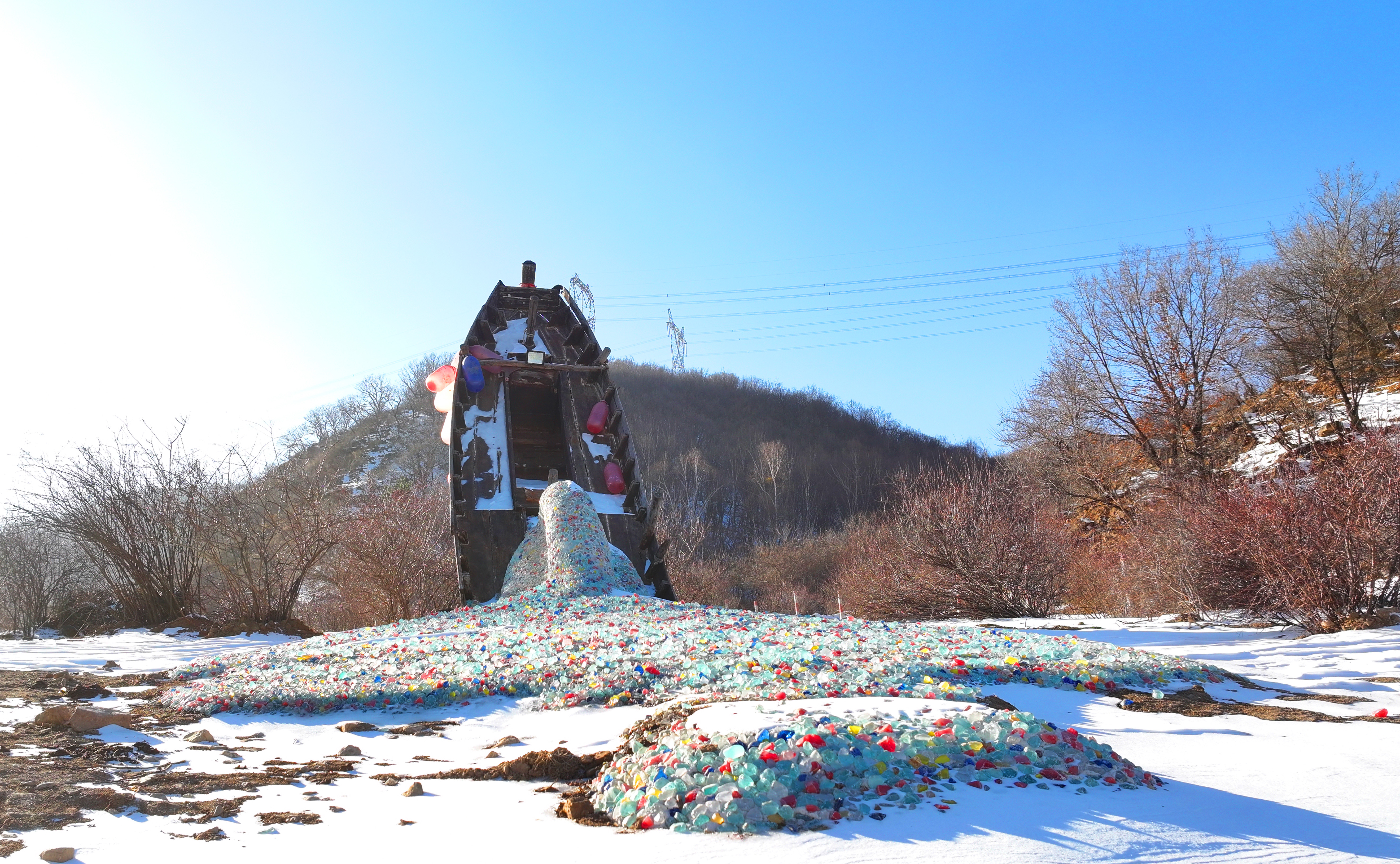 的故事。它通过废旧木船倾倒彩色石子的强大意象,寓意着人类文明的历程如同一场远航,而最终的圆满,是与自然达成和谐,将拼搏的痕迹转化为大地上新的风景。同时,每一颗石子就如来到弓阳的每一个人,如星星一般,聚石成形,石头从山来,到山去,依然是风景的一部分,过程与结果尽显人类痕迹与自然与人造物的融合。