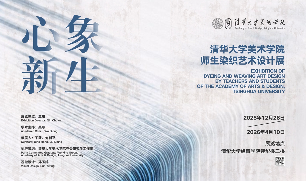 2025年12月26日,“心象·新生——清华大学美术学院师生染织艺术设计展”在建华楼(经管新楼)三层长廊正式开展。展览由清华大学美术学院党委书记覃川担任展览总监,清华大学美术学院院长吴琼担任学术主持,清华大学美术学院党委研究生工作组组长丁荭和副组长刘利平担任策展人,清华大学美术学院党委研究生工作组执行策划。展览时间从2025年12月26日延续至2026年4月10日。