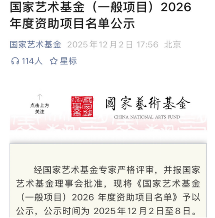 据了解,2026年度国家艺术基金(一般项目)在申报受理期内共有7539个项目主体确认提交11523个项目,经专家评审后,评选出879个资助项目。