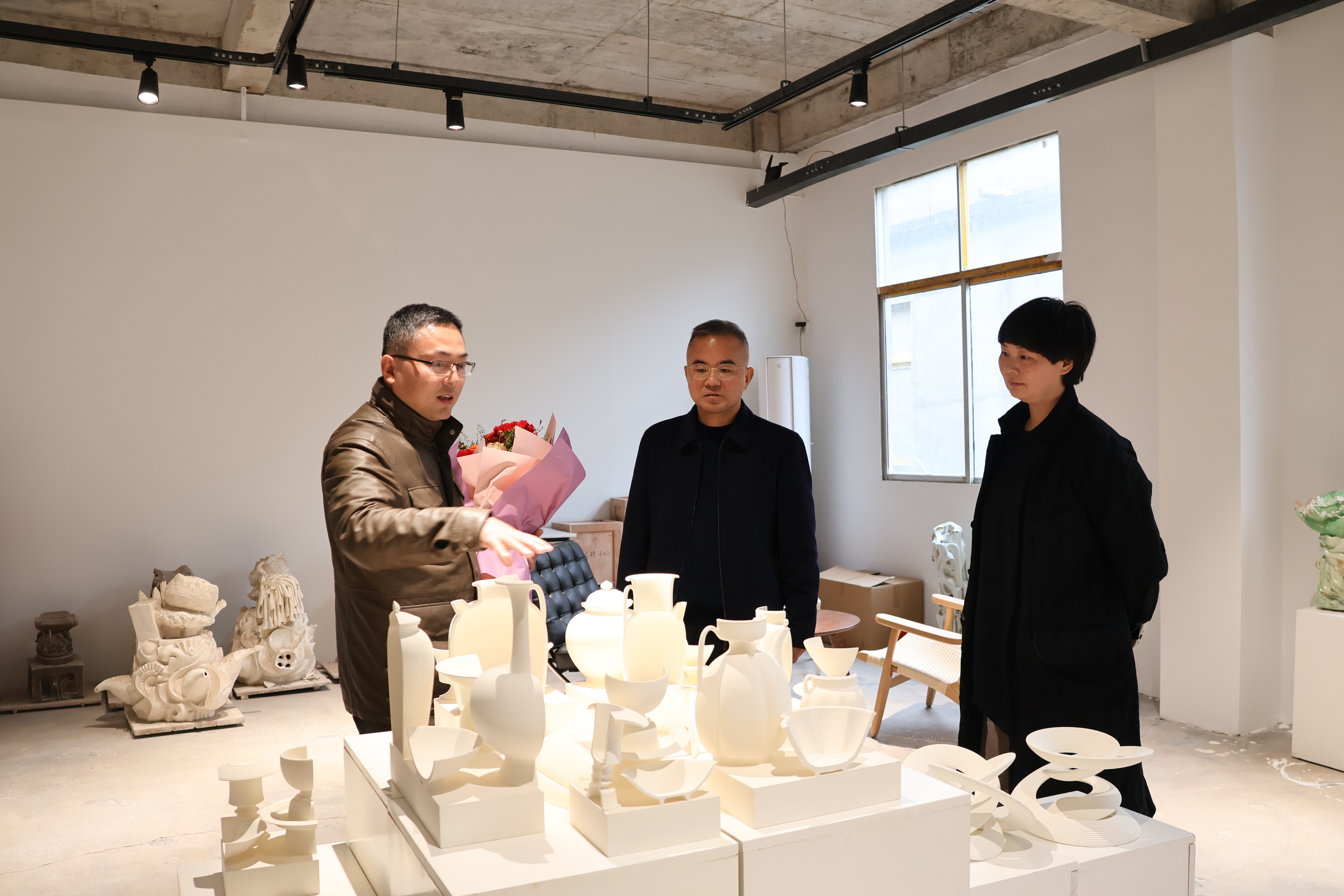 调研过程中,蒲守智与老师们亲切交谈,仔细察看工作室的教学科研环境,细致询问科研项目推进情况,深入倾听艺术创作背后的思考与探索。他对各位老师长期扎根瓷都沃土、坚守匠心筑梦的治学精神表示赞许,对他们深耕陶瓷领域、为学校学科建设与科研创新作出的贡献表示衷心感谢。