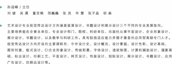 视觉传达设计专业围绕印刷出版、视觉展示和品牌形象等传统媒介展开教研的同时,逐与当今视觉环境和媒介应用的改变深度融合,这一融合使得过去围绕静态图形展开的视觉设计,转向以研究艺术设计领域内各类图像信息传达为主要目标。本专业将以视觉信息的交流与传导为主要目的,通过信息内容的组织、视觉叙事的搭建、符号形式的选择、专业实践的交叉,融入电子媒介表达、用户终端界面设计等多领域、全方位的整合推广,加强人与人、人与物、人与社会之间沟通交流的可视化信息方式,强调艺术特色、情感表达与人文情怀,尊重并超越传统的印刷设计、平面设计、包装设计等概念,横跨多种媒介,深入研究图形与图像设计、认知与体验设计、交互与交流设计,同时不忘为学科注入可持续性、协作性、伦理性等多元文化发展理念。