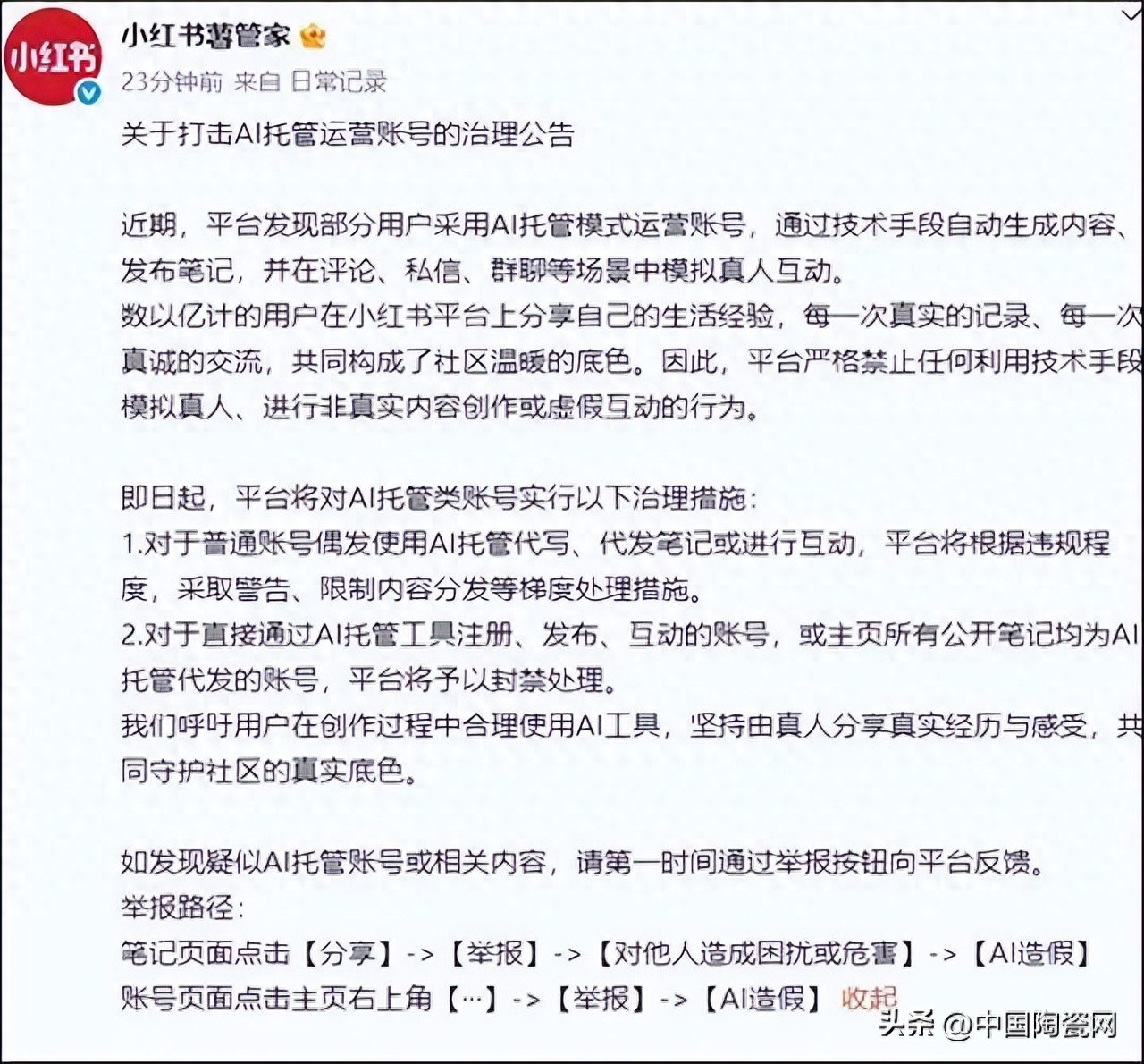 2026年3月10日,小红书发布公告,明确治理AI托管运营账号,强调由真人分享真实体验,以维护社区真实底色。此前,不少用户依赖AI批量生成“种草笔记”,追求流量快感,但平台此次行动标志着对AI滥用的首次明确规制,并凸显了“活人感”在内容生态中的稀缺价值。