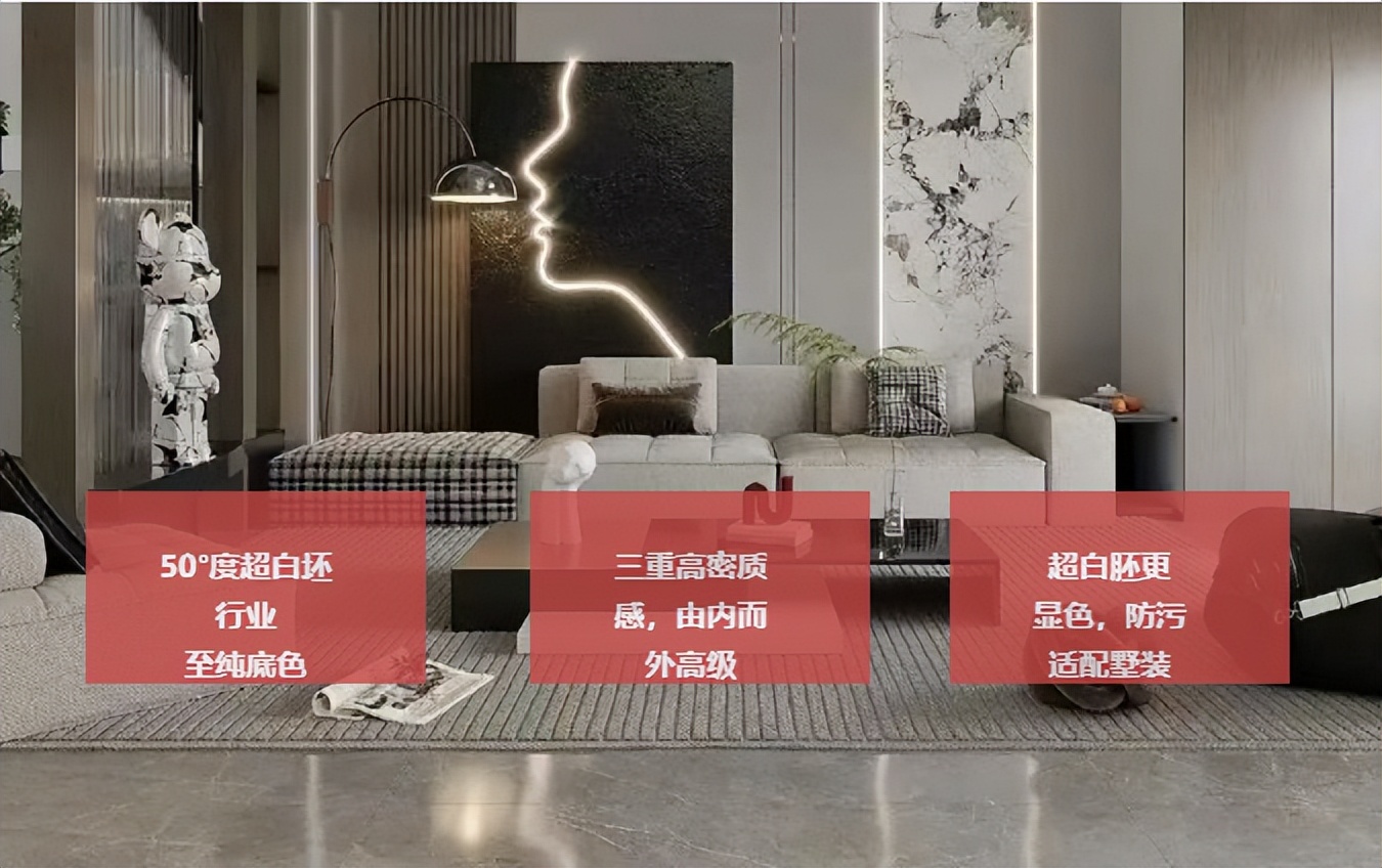 该产品精选高纯度天然白泥,经精细除杂与高温磁化工艺,使坯体白度达到50度,呈现通体净白、细腻油润的玉石触感,为釉面提供纯净画布,确保纹理与色彩精准还原。其核心优势在于高纯度、高磁化度与高油润度:坯体致密抗污,长期使用不变色;硬度与耐磨度达岩板标准,适用于全场景;质地油润光泽柔和,适配多种装修风格。
