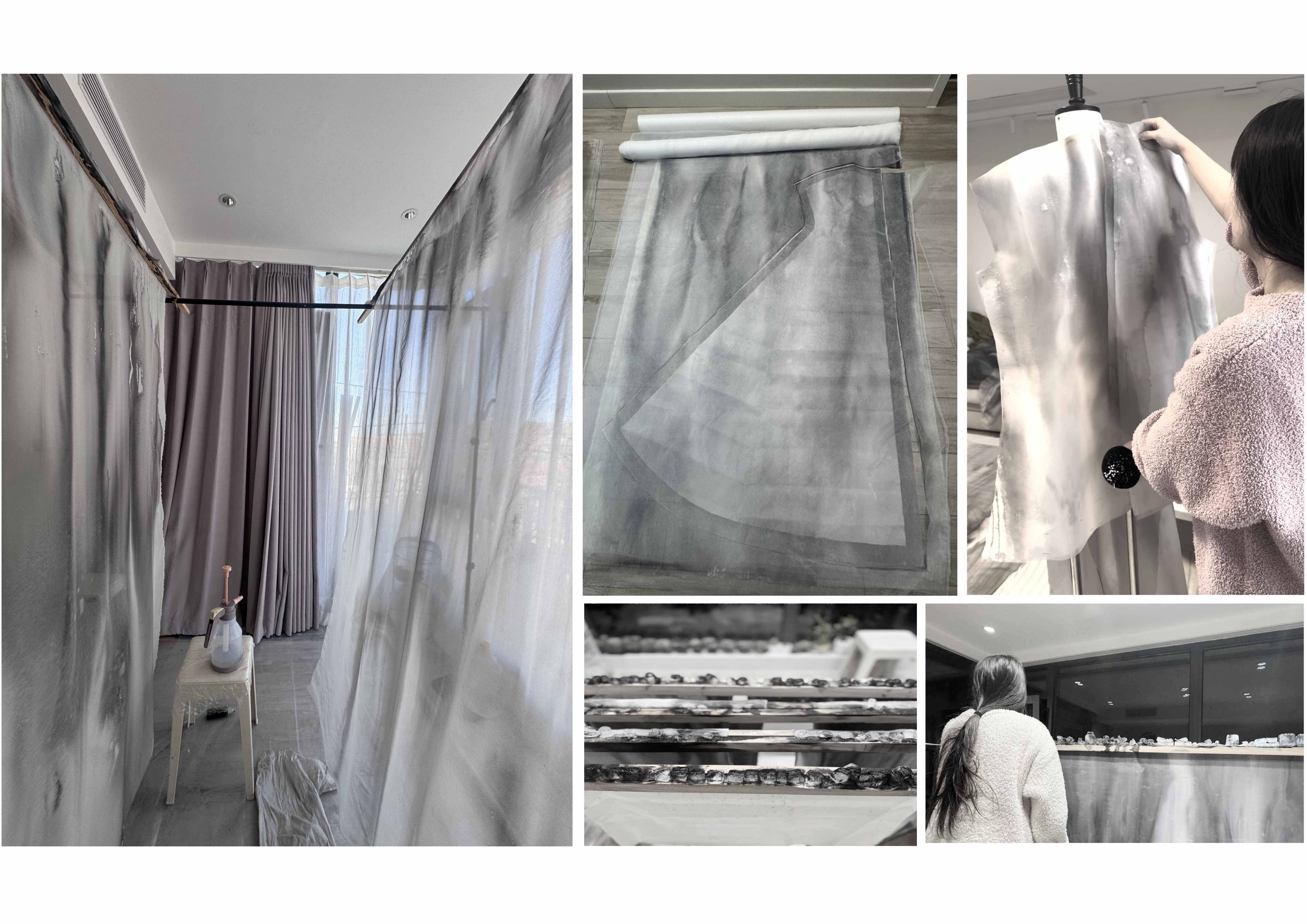 在工艺表达上,作品以自然冰染营造时光流转氛围,以手工植绒与羊毛纤维起绒复刻“影”的柔糯肌理。多重工艺虚实相间,在含蓄与舒展之间演绎影迹的多层次叙事张力。