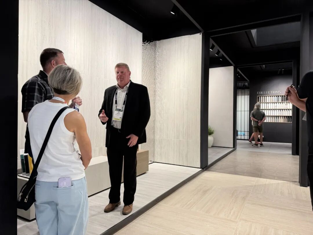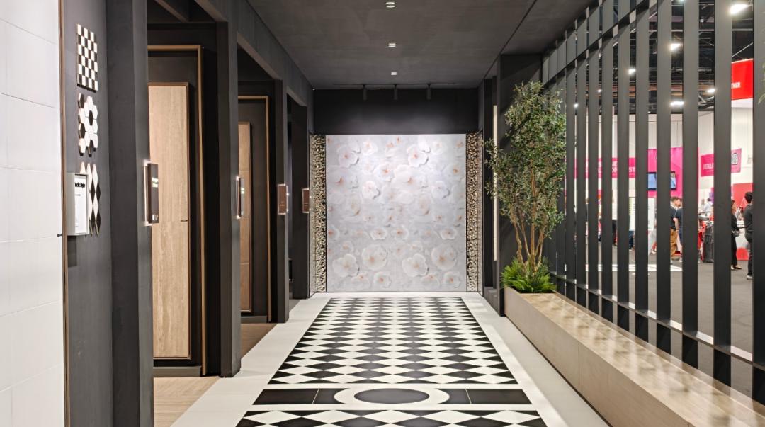 马可波罗重点展示了2026年新品“当代仿古 质感新生”系列。该系列以复古未来主义为核心,融合经典质感与现代设计,通过数码微浮雕平台3.0技术,在光泽、立体感、触感等多维度实现突破,为空间设计提供了更丰富的材料选择。展会现场通过层次丰富的材质呈现与沉浸式互动体验,吸引了众多国际观众驻足交流。