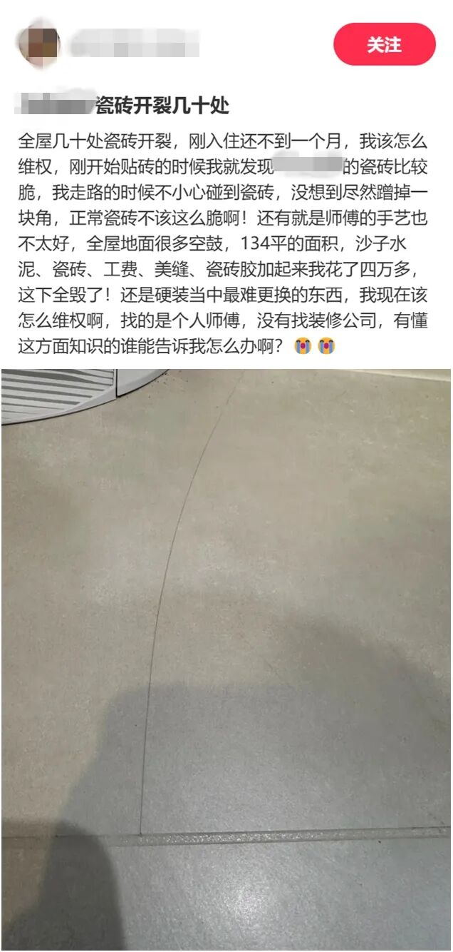 这位网友在笔记中说,她的新家铺贴了某知名瓷砖品牌的产品,入住尚不足一月就出现几十处开裂,其实在铺贴时就感觉瓷砖比较脆,不小心碰到竟会掉角,同时也认为铺贴师傅手艺不佳,导致地面存在多处空鼓。面对这种情况,她无奈发问:“我现在该怎么维权?”