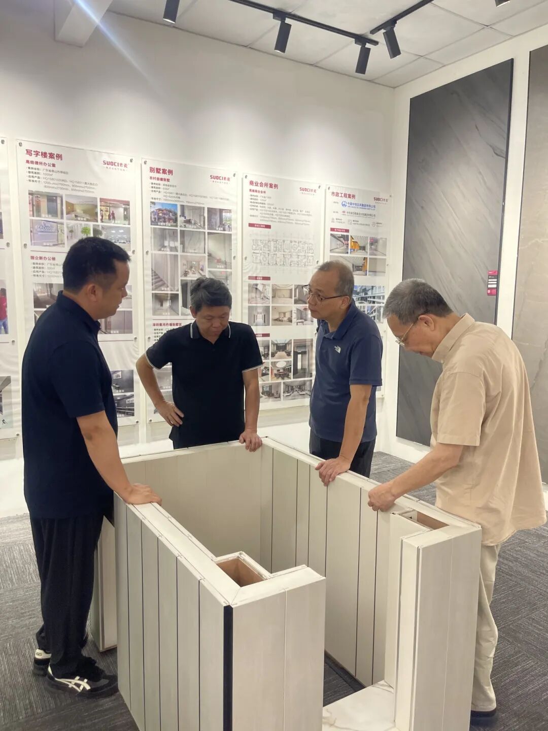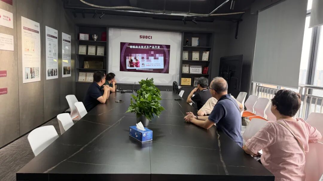 索瓷公司总经理蒙政强陪同专家团参观产品展厅,并详细讲解装配式集成岩板的创新工法、核心优势,以及在公建项目、高端家装、城市旧改中的落地案例。专家团重点了解产品在既有建筑改造、存量房更新中的应用表现,对其干法施工、高效装配、环保耐久、适配性强等特点给予高度评价。