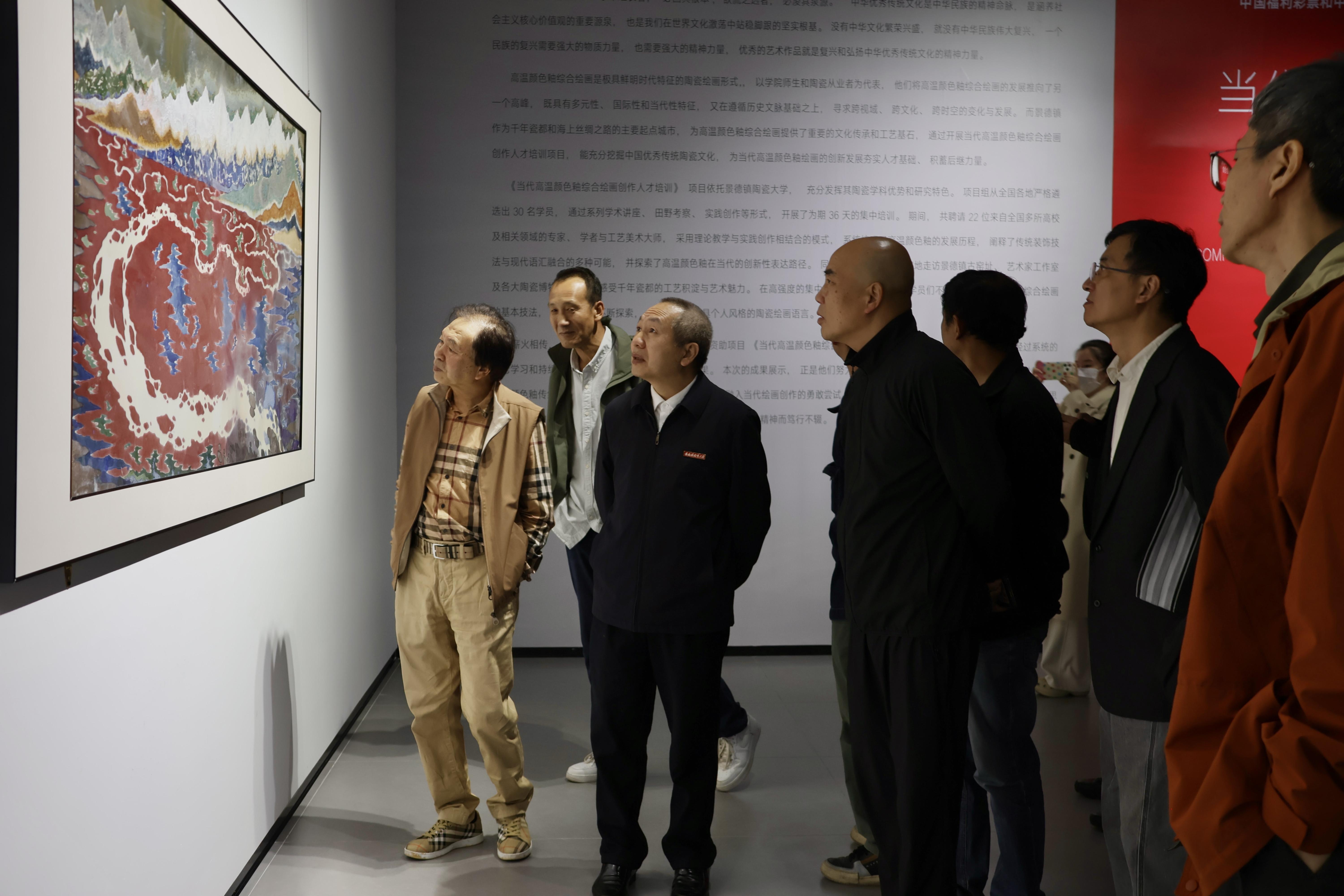 据悉,《当代高温颜色釉综合绘画创作人才培训》项目依托景德镇陶瓷大学,充分发挥陶瓷学科优势和研究特色,项目组严格遴选出来自全国各地的30名学员,通过系列学术讲座、田野考察、实践创作及成果展览等形式,集中培训历时36天,共聘请22位来自全国多所高校、多个领域的专家、学者与工艺美术大师,采用理论教学与实践创作相结合的教学模式。系统梳理高温颜色釉的发展历程,阐释了传统与现代装饰技法结合的多种可能,以及如何探索高温颜色釉在当代的创新性表达等问题。本次项目成果展共展出颜色釉绘画作品100余件。