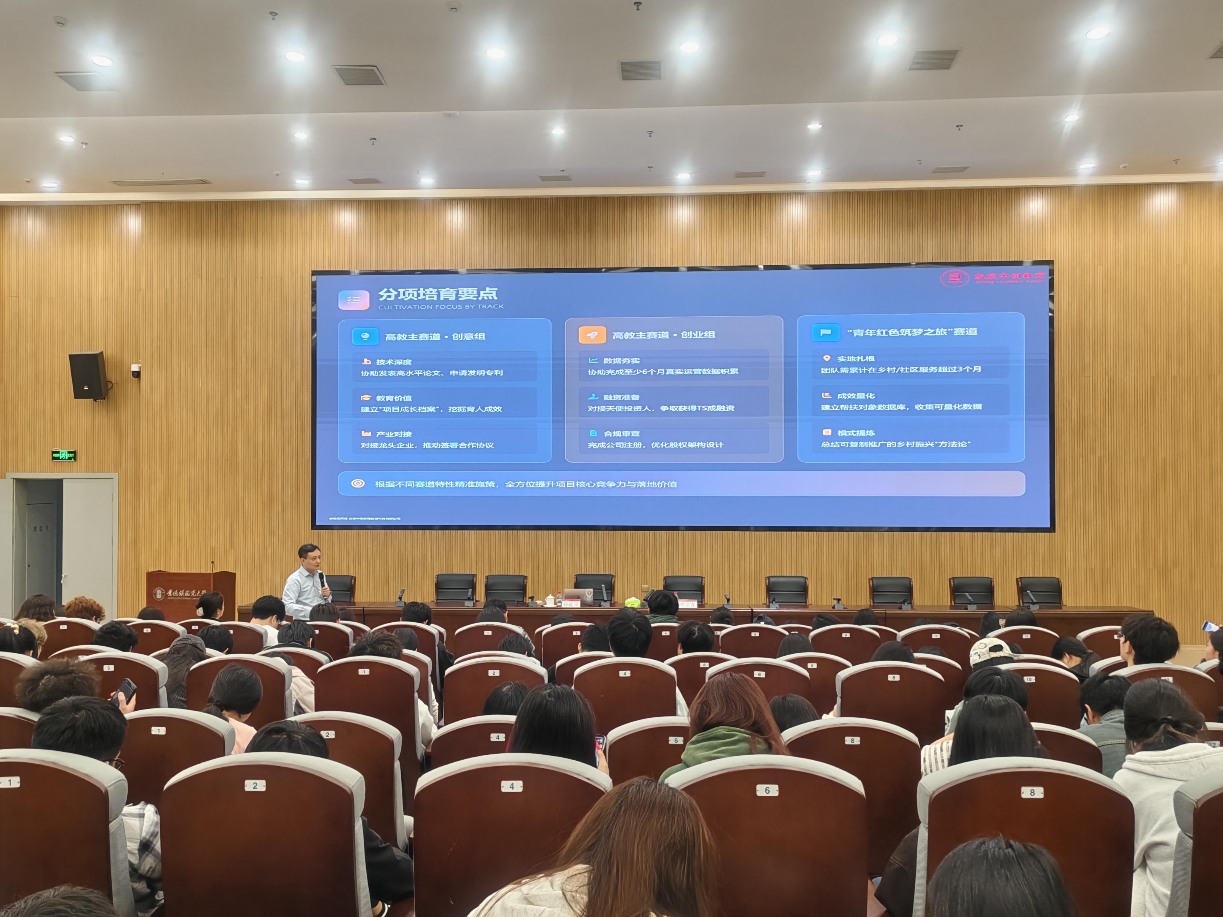 本网讯(教务处(创业学院)邹金成)为深入推进创新创业教育改革,系统备战中国国际大学生创新大赛(2026),4月9日下午,我校在湘湖校区研究生实验室楼一楼报告厅举办《中国国际大学生创新大赛2025国金项目深度解析与2026备赛策略》专题培训讲座,教育部首批全国万名优秀创新创业导师、北京中创教育集团董事长徐俊祥应邀主讲。校党委常委、副校长陈云霞出席并主持讲座。教务处(创业学院)有关负责人、各学院就业创业专员、参赛师生代表及创新创业学生社团成员等300余人参加讲座。