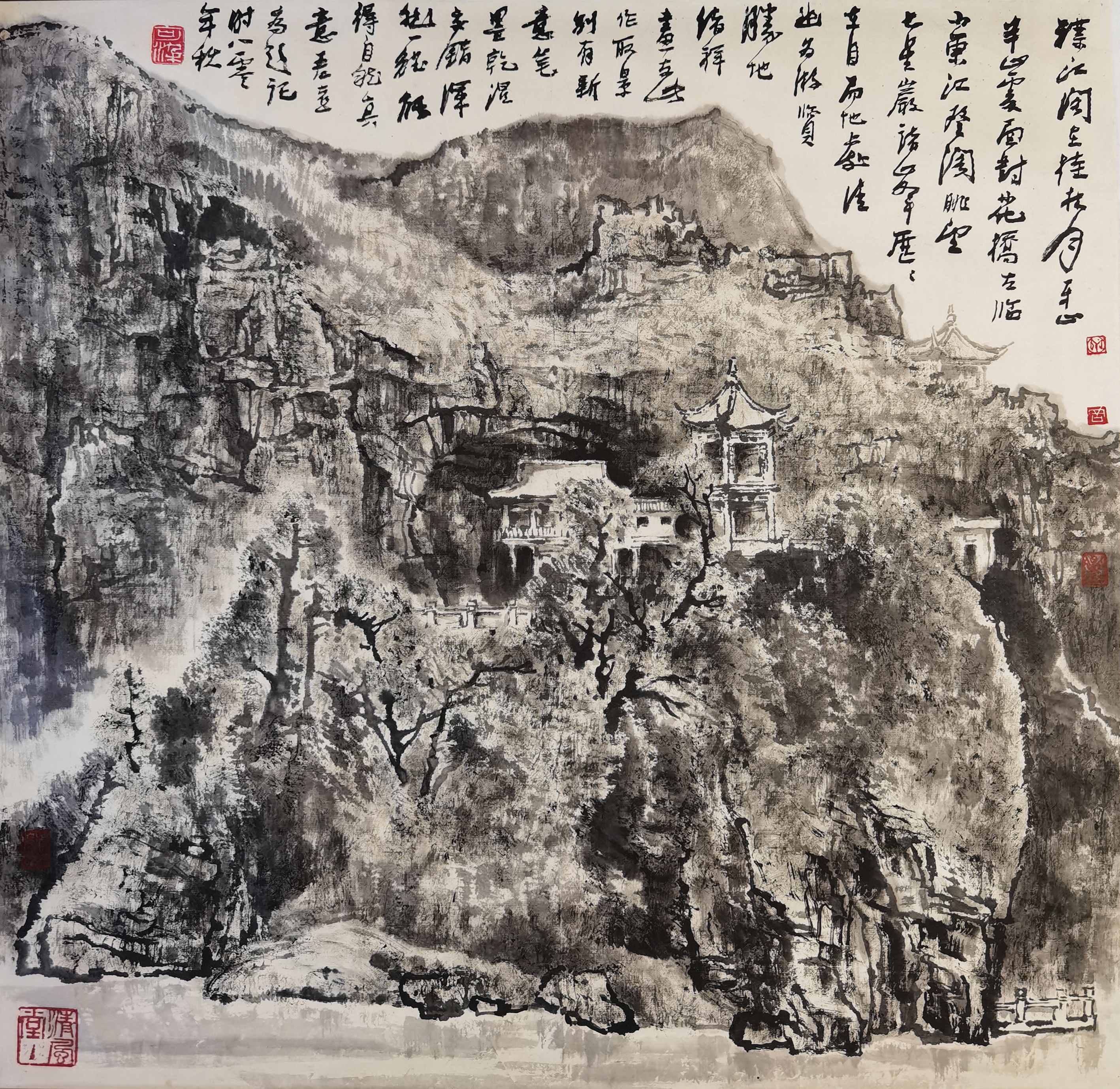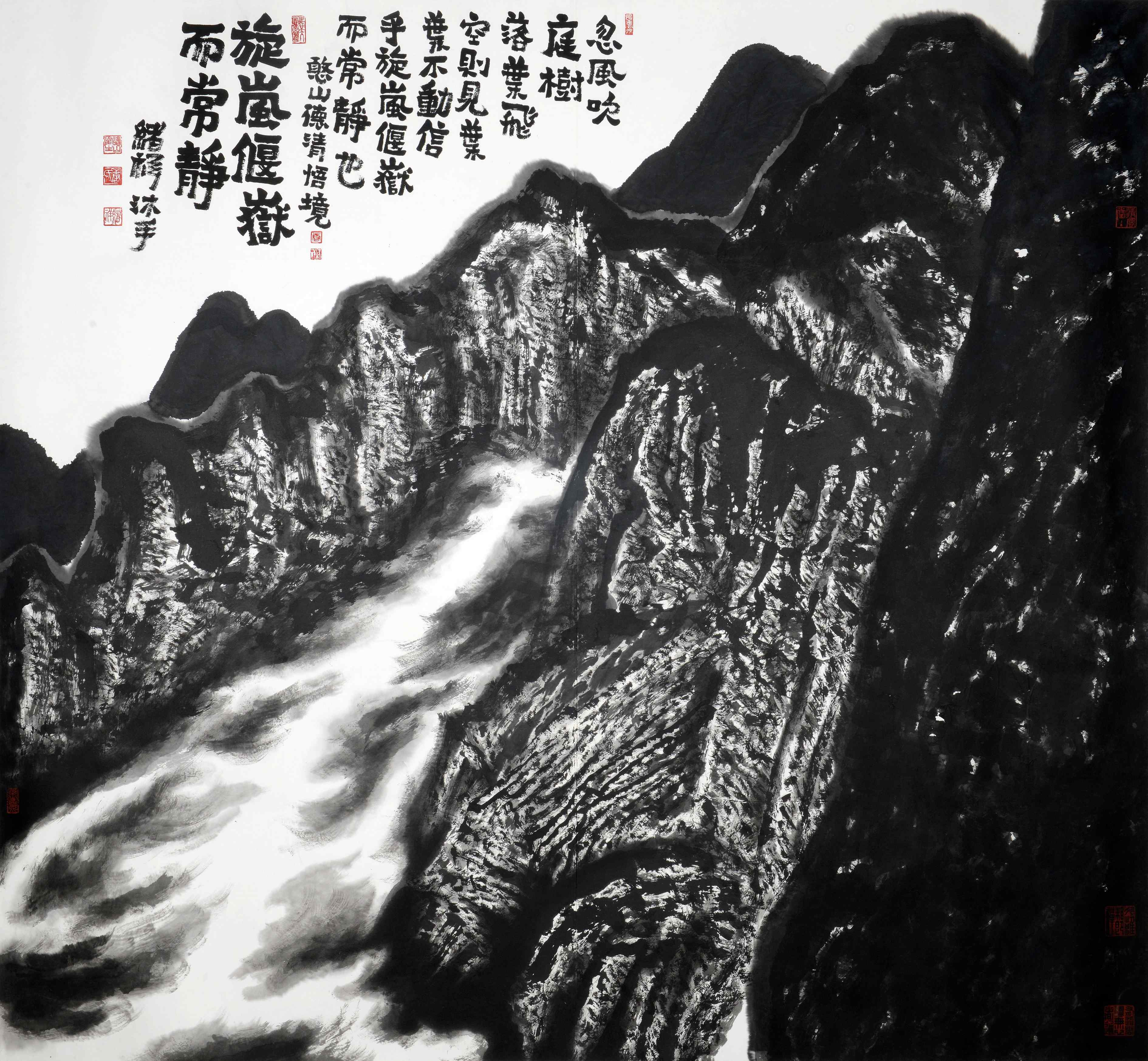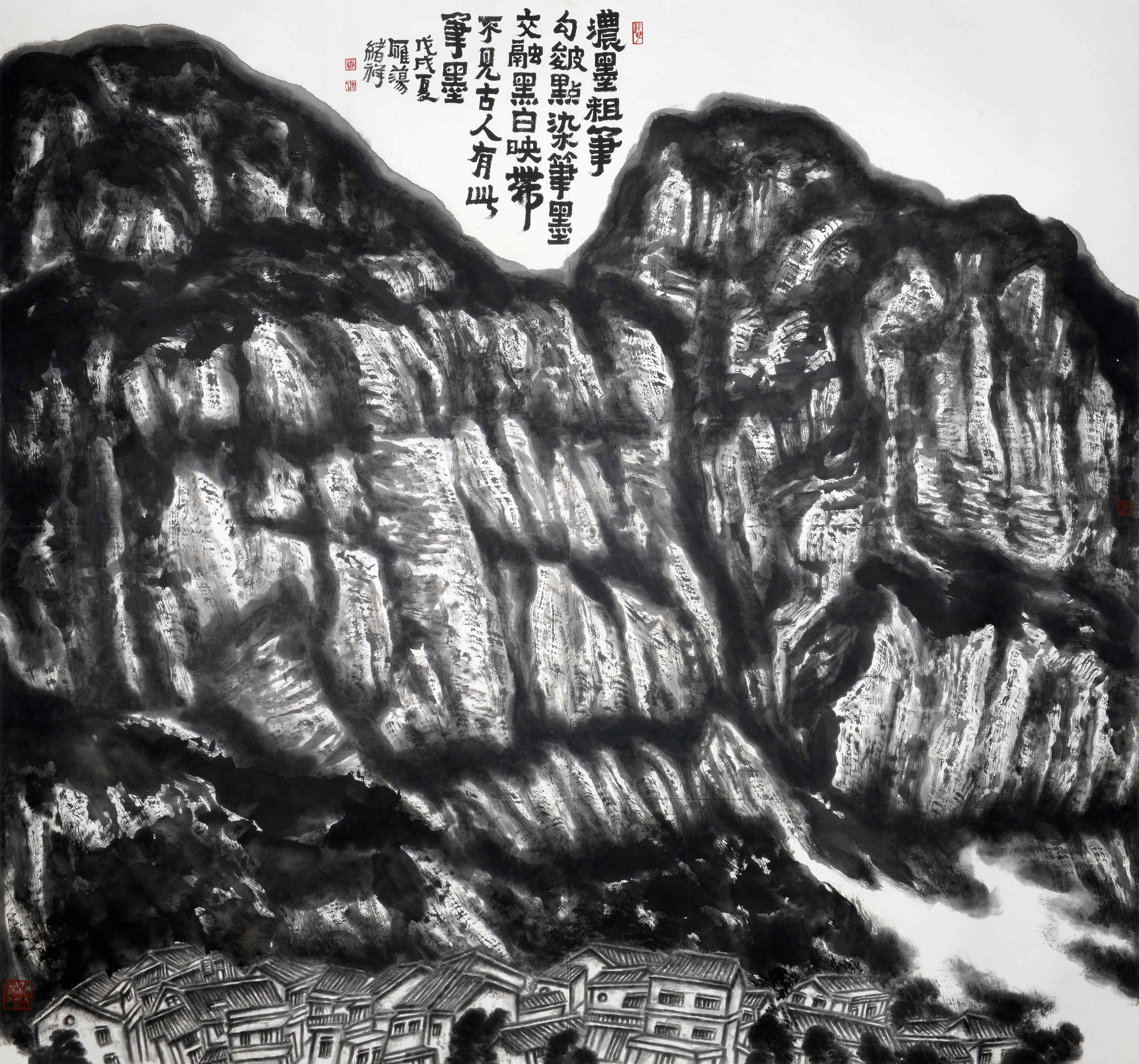 他的水墨画“师造化”,直探景物内在诗性。他调动中国画写意的泼墨、破墨、积墨、宿墨,以及各种皴法的表现力,以凝重深沉、刚柔相济、动静互补、虚实相生的笔墨,将景物层层展现,于细蕴中见鸿蒙,活跃着大道自然的生命气象。